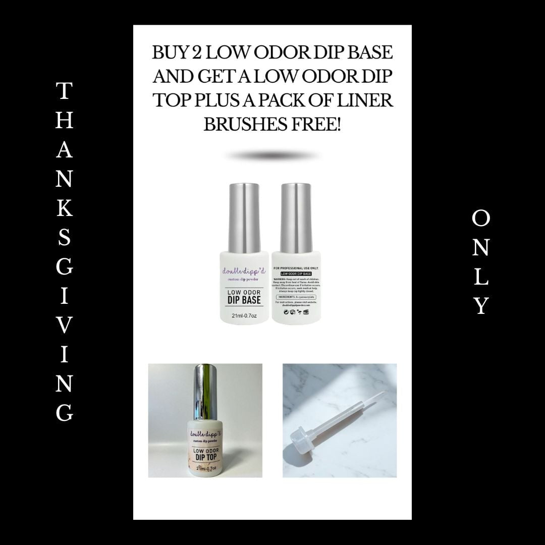 Buy 2 Low Odor Dip Base and get a FREE Low Odor Dip Top PLUS a pack of liner brushes FREE!