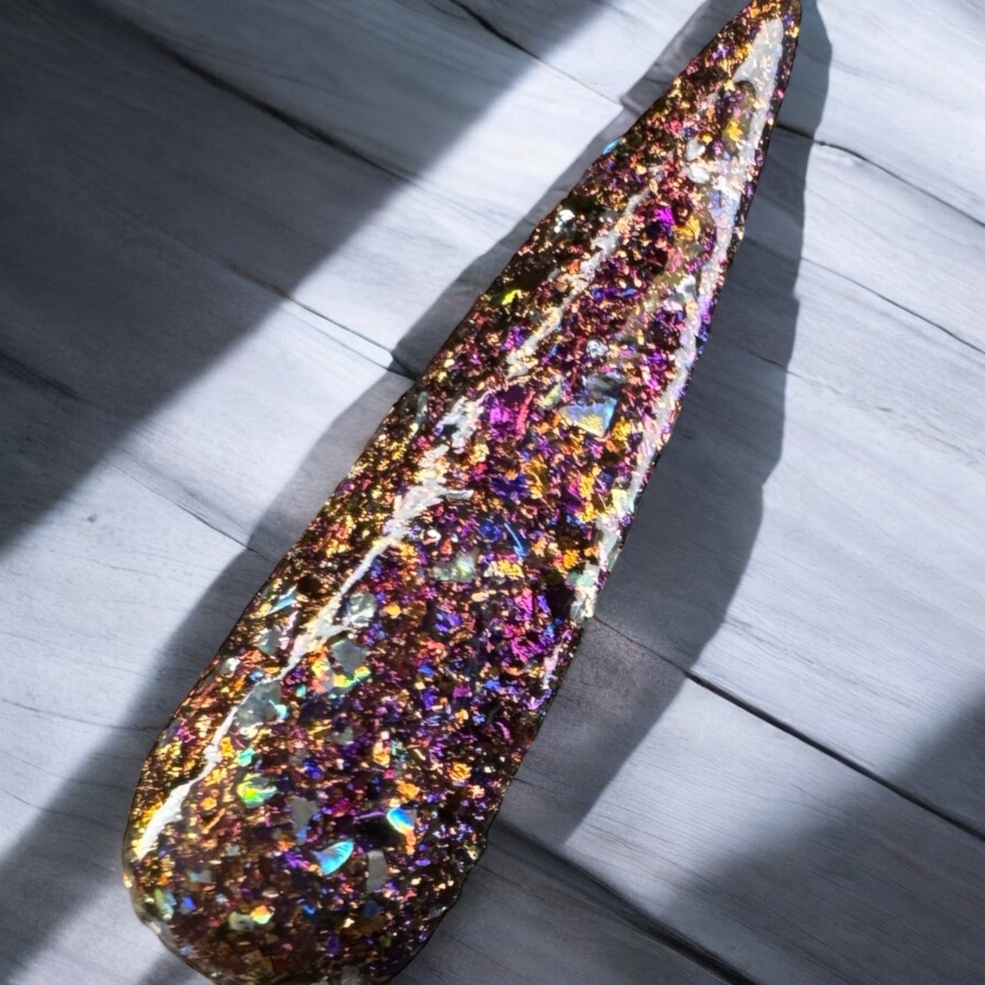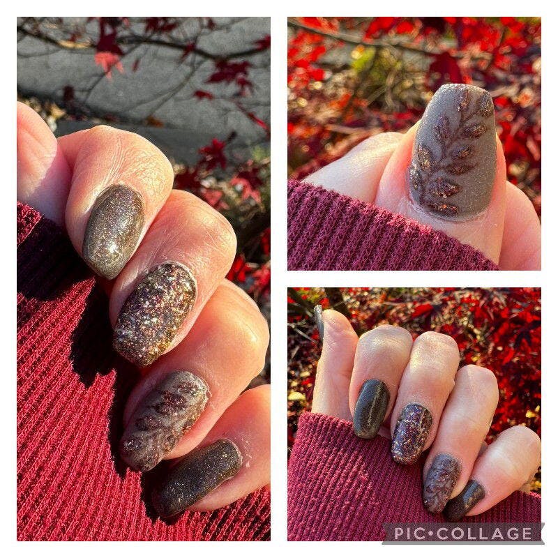 Falling Into Leaves was one of the October 2024 Powder Subscription bag colors. Multi dimensional and colorful, this premium Chameleon Flake dip powder pairs with both Crisp and Cool (the solid) and No Plum Intended (the shimmer) from the Subscription Bag.