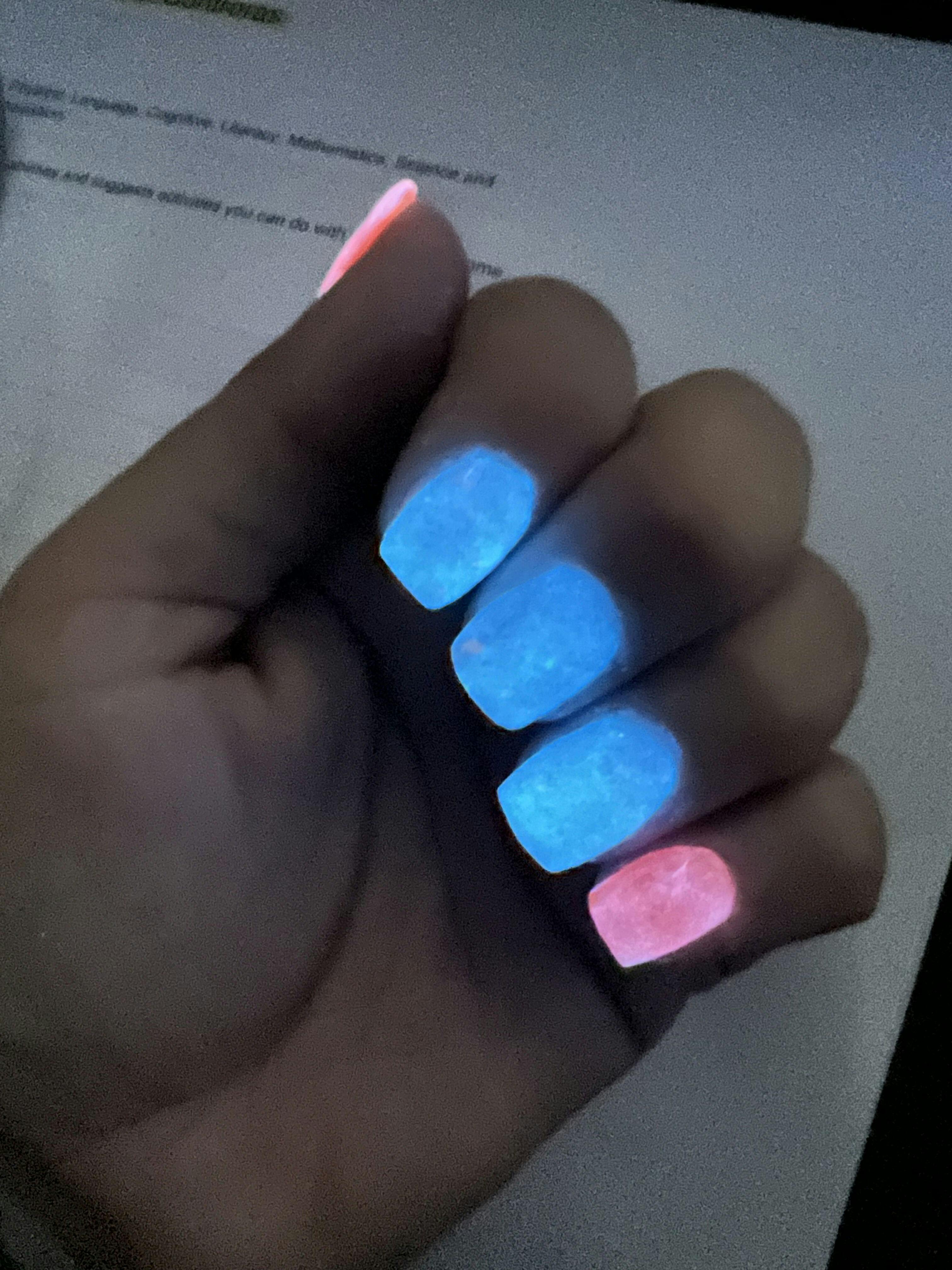 In Glow Motion is a clear dip powder that glows Sky Blue! With this powder, you can make any manicure glow!