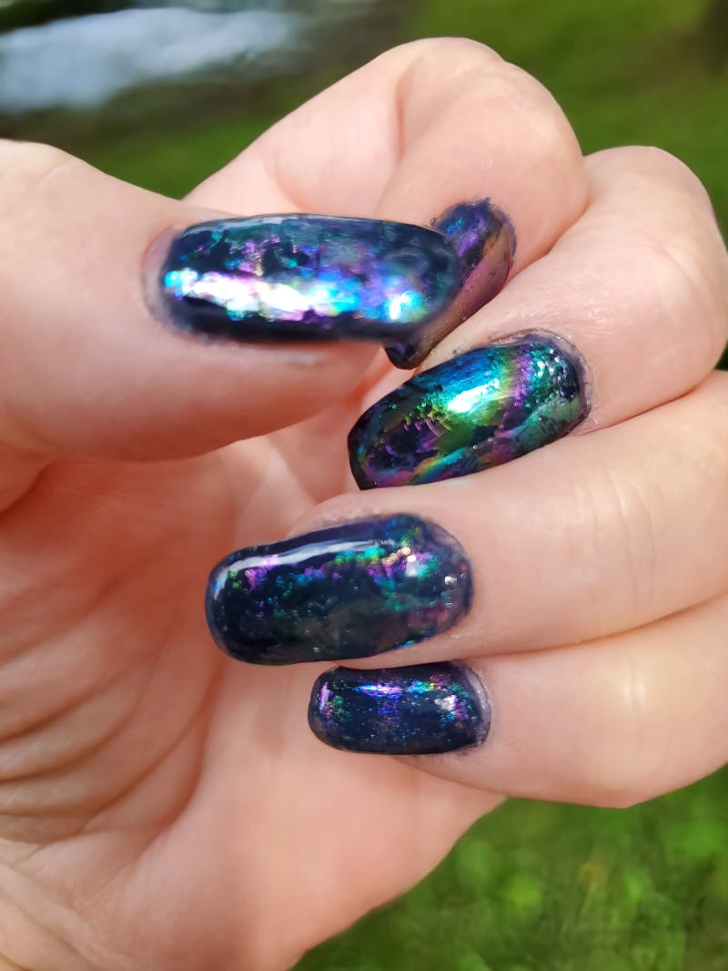 Step 4: Press foil sheet onto your nail in a flat fashion to avoid crimping of the design. Press with your fingers to make the transfer to your nail. You can also use a silicone nail tool. Note: the Foils with the silver backing need to be wiped with an alcohol pad before use. This will make the transfer much easier. Wipe and let dry before using. Alternatively, you can place the foil on a part of the nail and quickly press and lift dabbing different areas of the foil all over or on certain parts of the nail.
